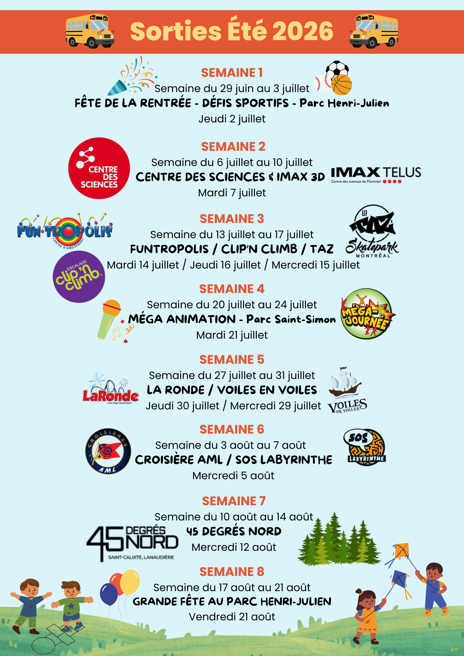 Tous les groupes font une grande sortie par semaine ainsi qu’une après-midi à la piscine ou à la pataugeoire. À travers la semaine, vos enfants feront des jeux actifs, la pratique de sport, des activités artistiques, des expériences scientifiques et de la cuisine selon la programmation de leur animateur ou animatrice. L'animateur ou animatrice peut prévoir, aussi, des petites sorties à travers l’île de Montréal comme une visite au Biodôme ou une activité spéciale au Mont-Royal.